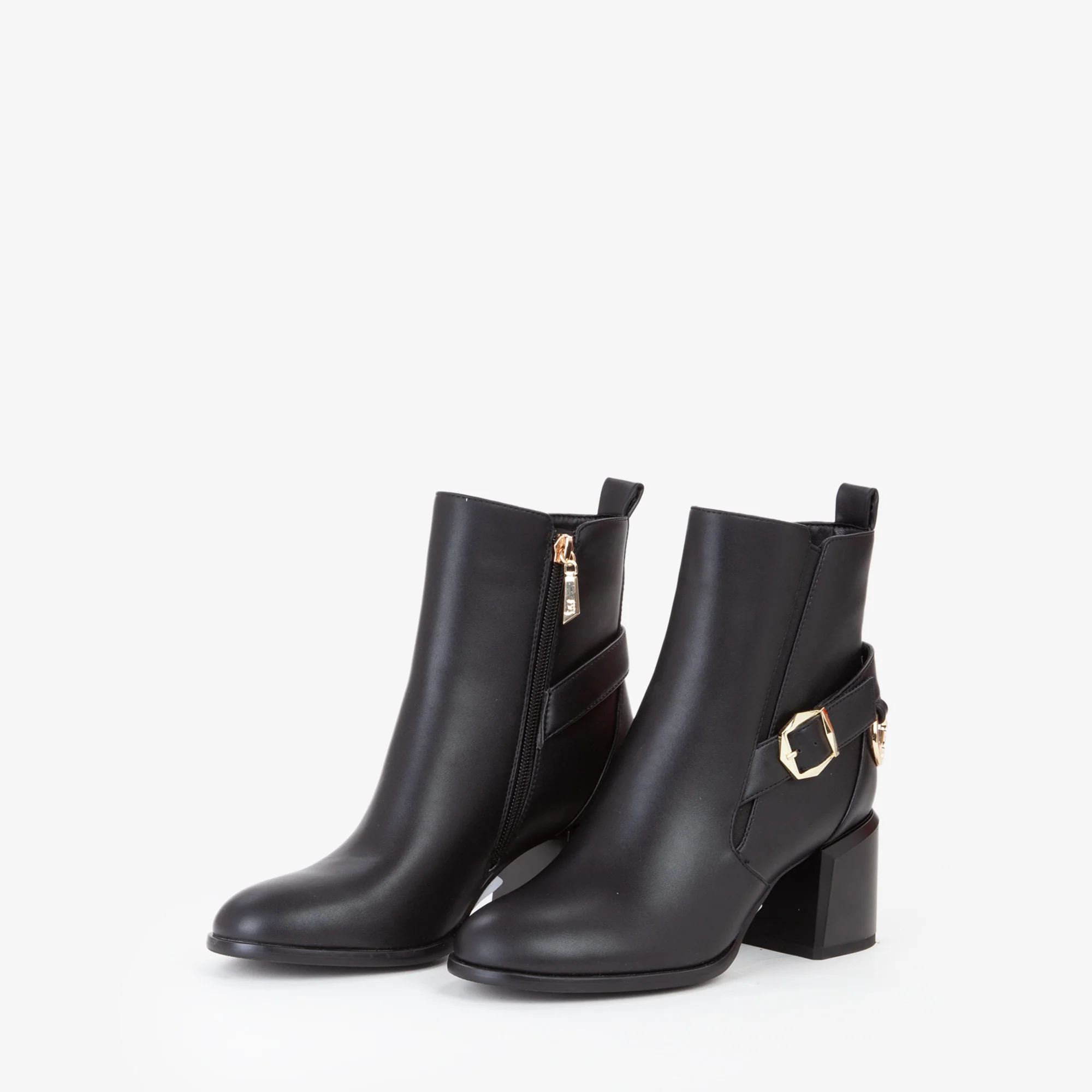 Stivaletto materiale sintetico, con tacco quadrato medio di altezza contenuta per un equilibrio ottimale tra stile e comodità. La tomaia è arricchita da una fibbia regolabile e un elegante dettaglio logo metallico dorato sul retro, che aggiunge un tocco sofisticato e distintivo. La suola in gomma garantisce una buona aderenza, rendendo la calzatura ideale per luso quotidiano in città. Perfetto per outfit smart-casual, si abbina bene a pantaloni skinny, gonne midi e cappotti classici, per un look raffinato ma moderno.undefined