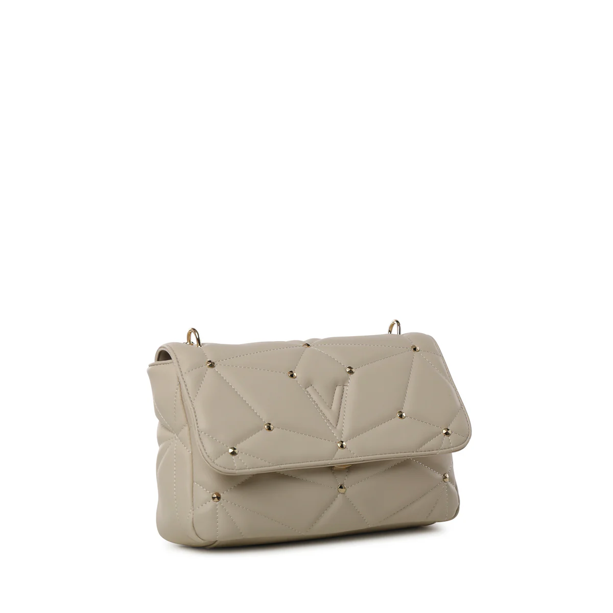 Pattina in nappa morbida con disegno matelassé geometrico, le borchie delineano le forme conferendo un appeal rock ai modelli.Iconica V su fronte borsa.
