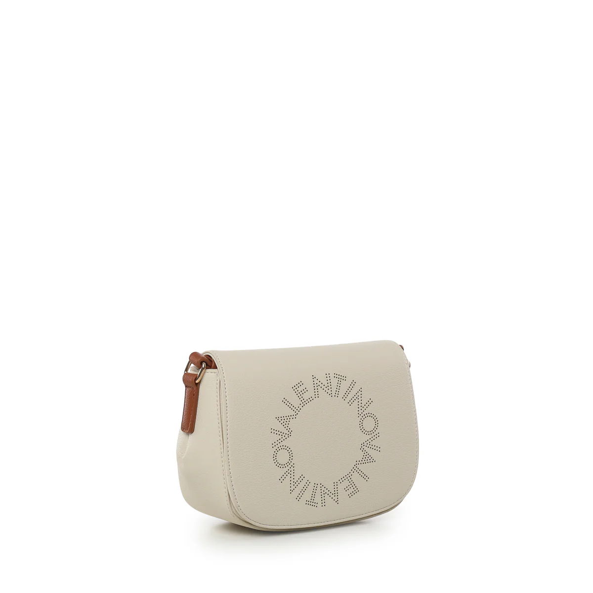 Borsa a spalla con patta in grana morbida riciclata, con logo forato centrale. Tracolla a contrasto e attacco manico intrecciato suentrambi i lati.