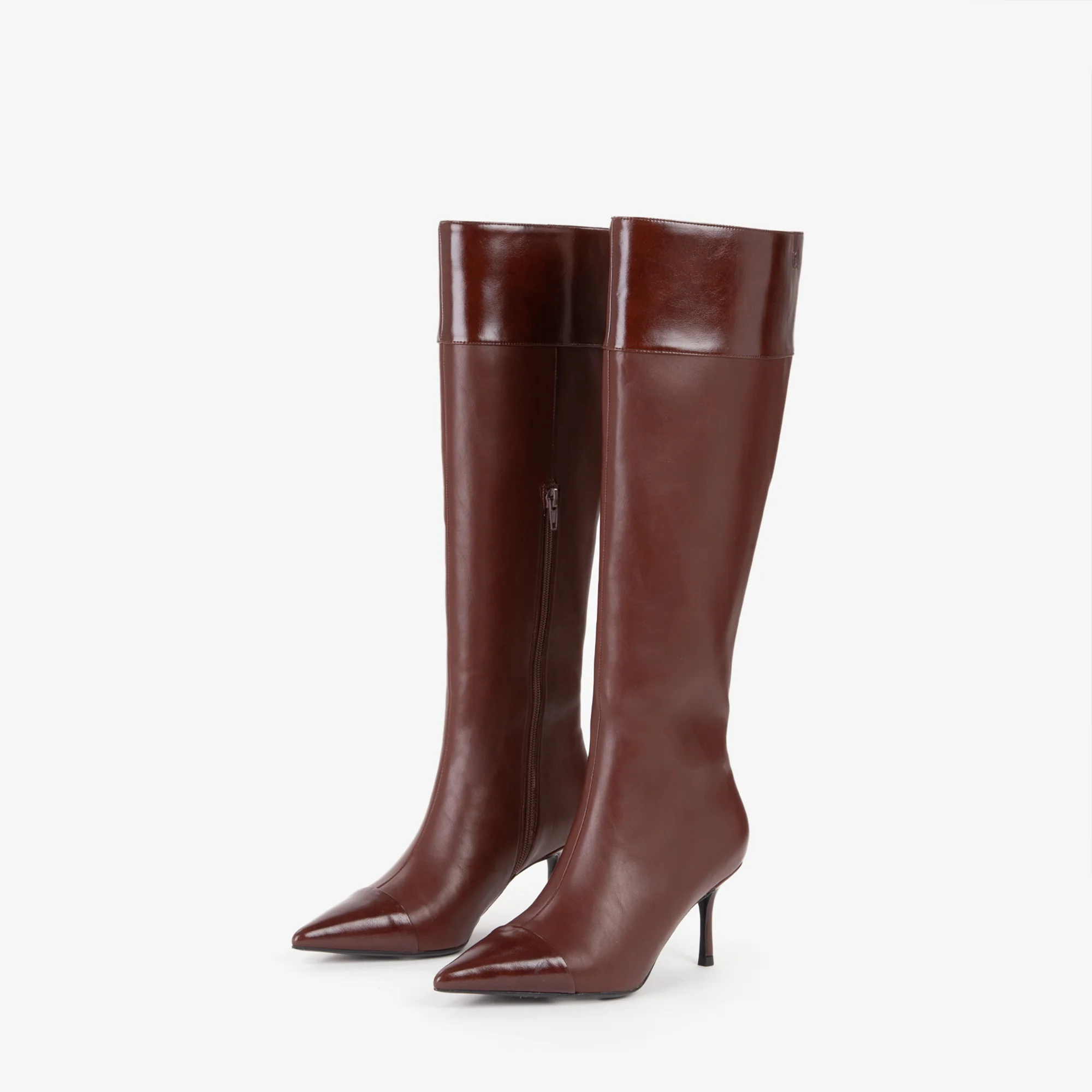 Stivale al ginocchio realizzato in materiale sintetico con finitura effetto pelle, caratterizzato da una tomaia affusolata e gambaledritto con inserto lucido a contrasto sul bordo superiore. La silhouette è completata da una punta sfilata e da un tacco sottile leggermente incurvato, che slancia senza sacrificare la stabilità. La suola è in materiale sintetico flessibile, ideale per un uso quotidiano. Perfetto con abiti midi o gonne longuette, per un look metropolitano raffinato.undefined